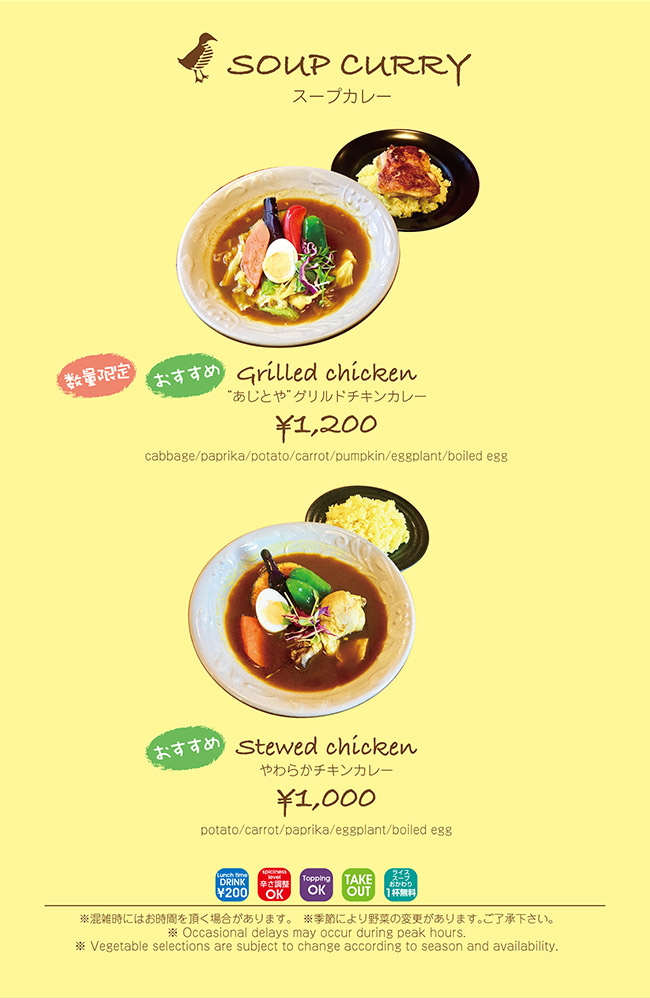 パリパリにローストされたグリルチキンが人気のあじとやグリルドチキンカレーをはじめ、フォークですっとほぐれるほど煮込まれたやわらかチキンカレー、無添加のココナッツミルク使用のオーガニックスパイスカレー、キーマチキンカレーなどが揃っています。