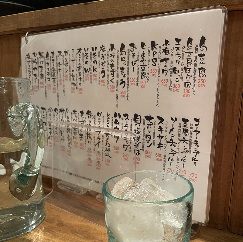 こちらはフードメニュー。島豆腐やモズク、らっきょう、ゴーヤーなど県産素材を使った小皿料理が並びます。リーズナブルなのでついつい頼みすぎてしまいそうです。